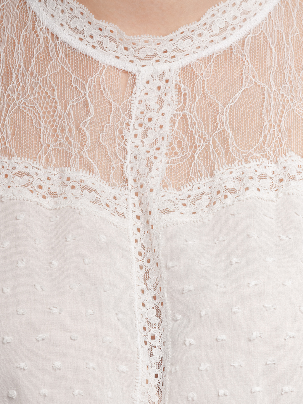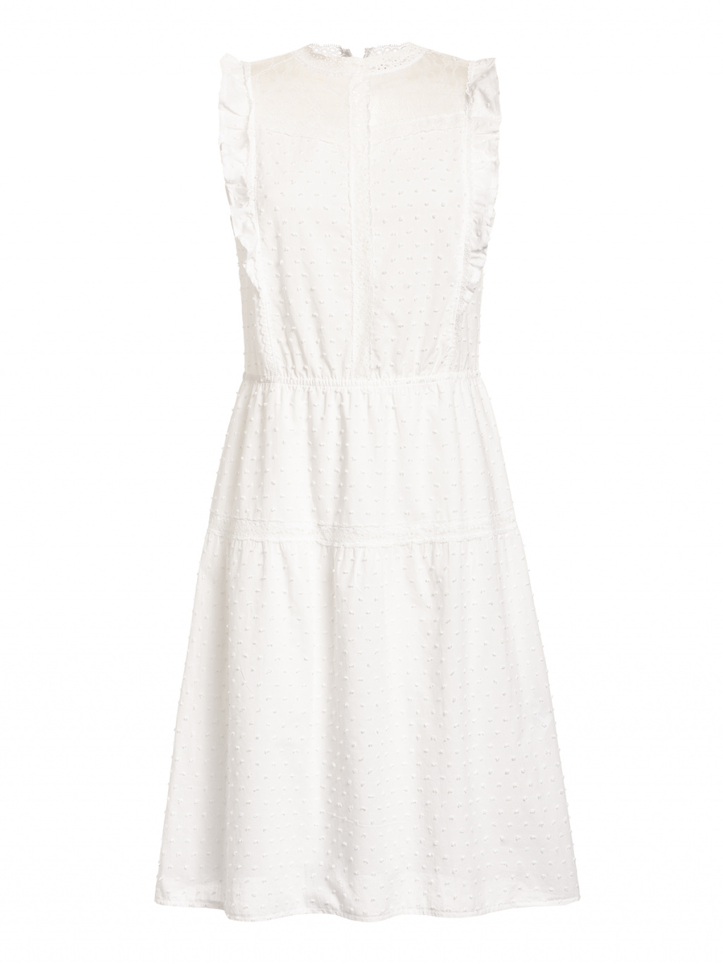 Ideální šaty na léto z příjemného bavlněného voálu s puntíčky ozvláštněné malým stojáčkem na knoflík a průhlednou krajkou v předním díle.