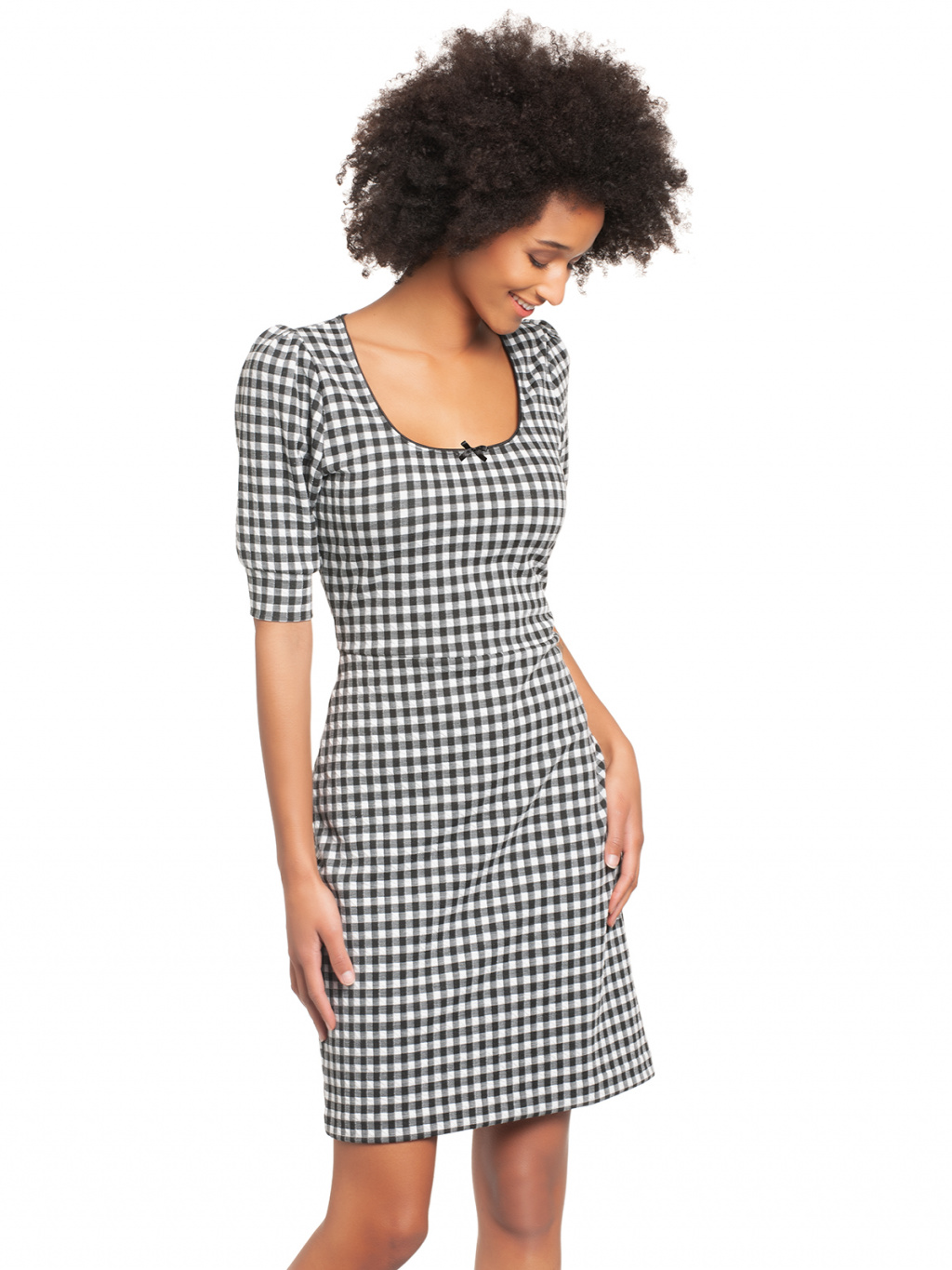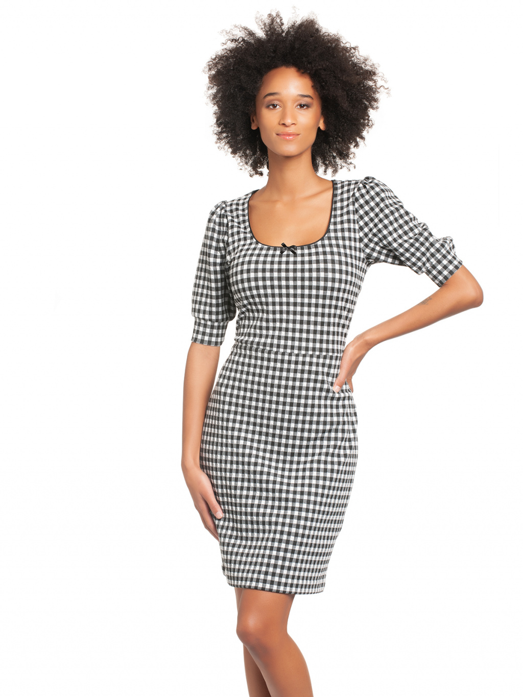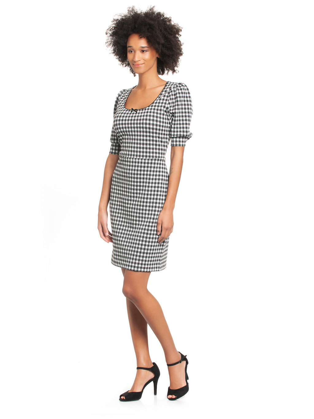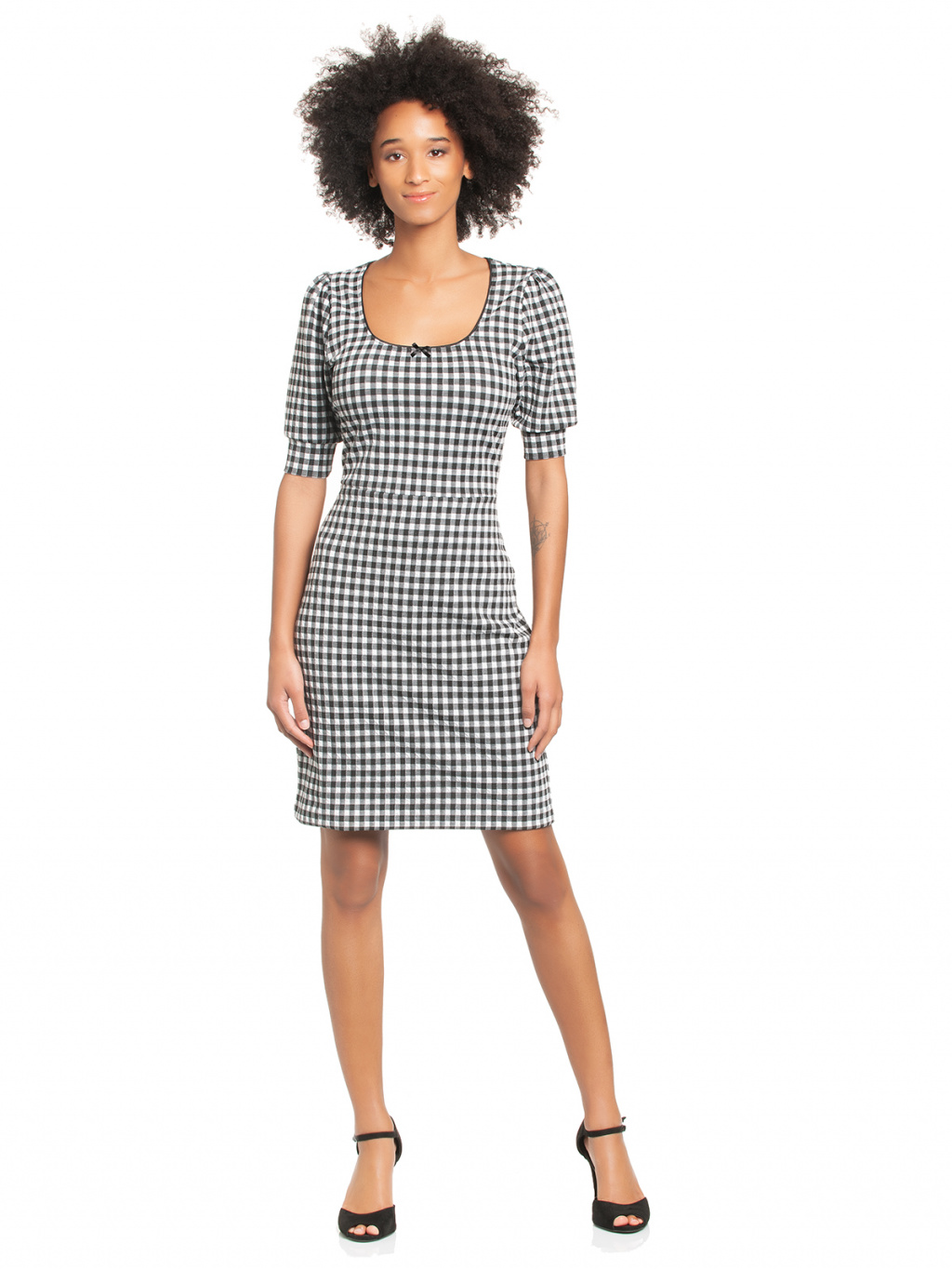 Nesmrtelný vzorek pepita zaručí, že budete na každé pracovní schůzce vypadat úžasně. Šaty perfektně sedí díky skvělému materiálu s podílem elastanu, dělícímu švu v pase a skrytému zipu na boku, který usnadňuje oblékání. Už jen lodičky a kufřík a jste připravená dobýt svět.