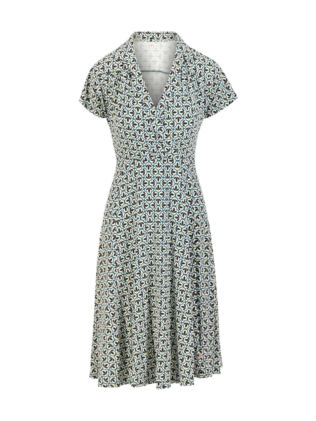 Šaty mají výstřih do V s límečkem a zavinovacím efektem.
