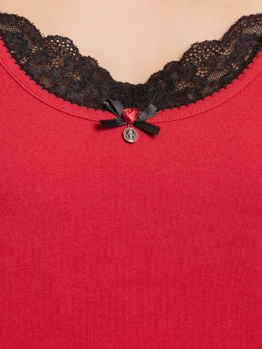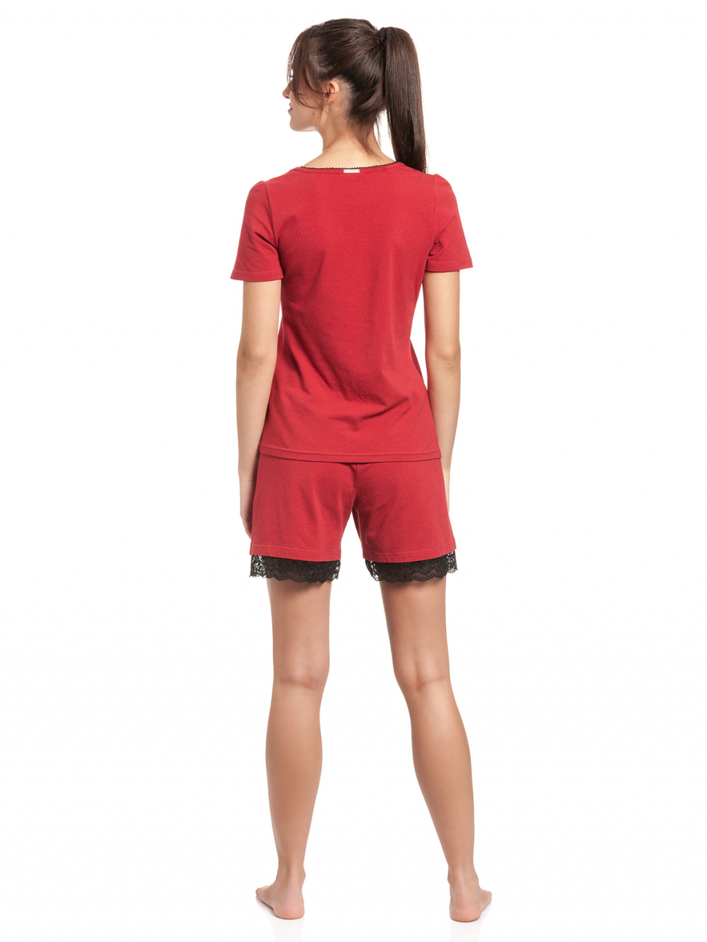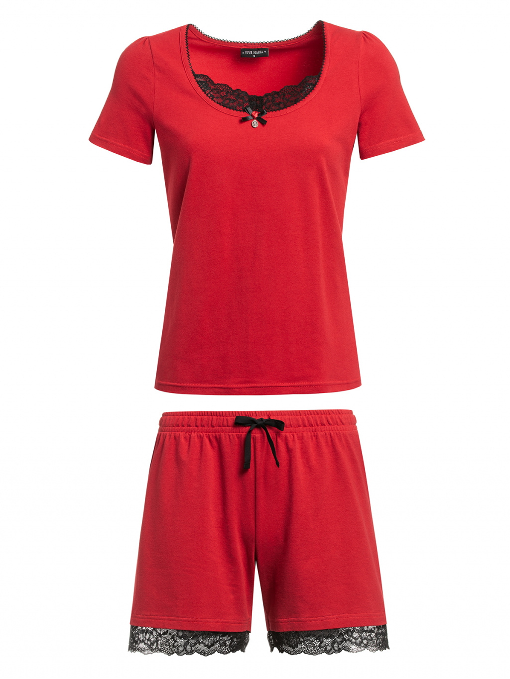 Červené letní pyžamo z příjemné bavlny s elastanem rozzáří detaily jako úzká černá lemovka, krajka a saténová růžička s kovovým přívěškem ve výstřihu. Dejte svým večerům a nocím jiskru!